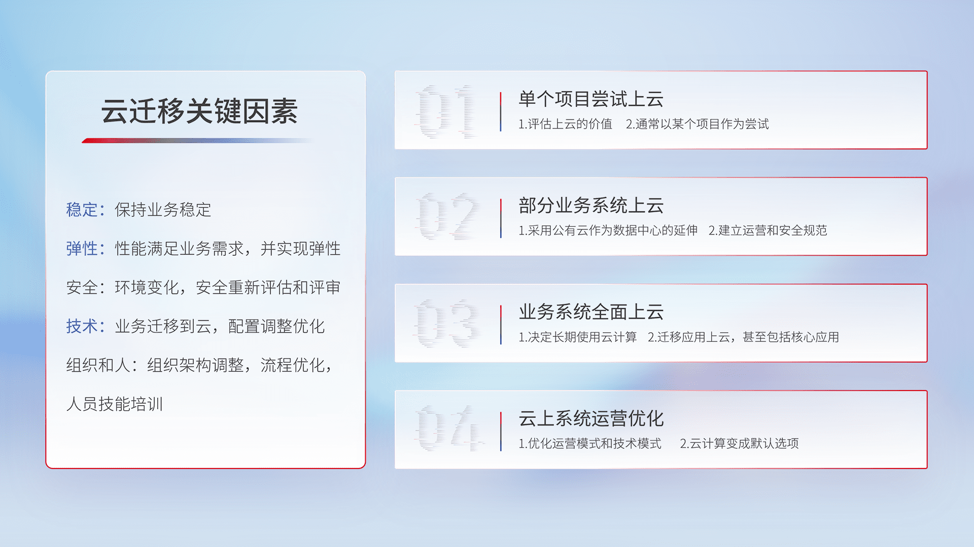 结合实际业务,,,,从规划设计、、、云平台选型、、、、云原生改造、、数据迁移、、、、集成交付,,,迁移全过程为客户识别最佳上云路径,,,,做好风险识别管理,,设计网络架构、、、、身份权限、、安全审计合规、、、操作审计、、、、日志审计、、监控告警策略、、、多站点容灾设计等,,,对云上基础设施进行整体规划,,,,提升IT治理水平,,,,以满足弹性、、、、高可用、、高性能的需求。。。。