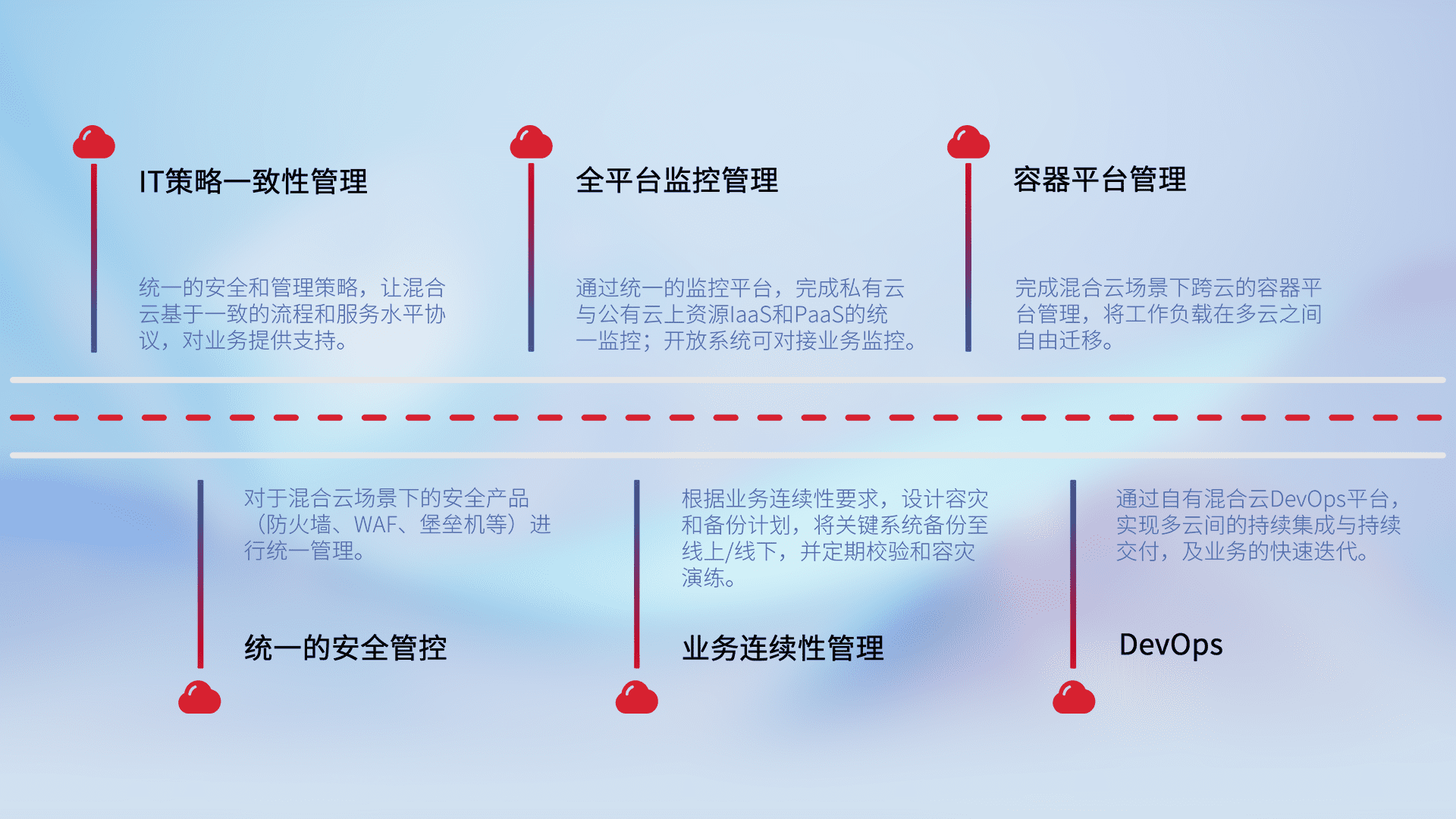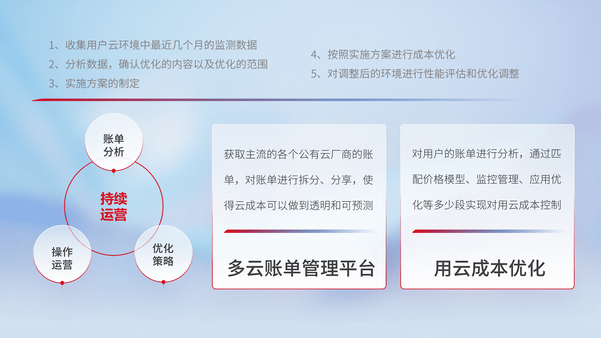 通过多云纳管,,,,以统一的资源数据模型把客户的云资源进行抽象和封装,,,进而实现对多云资源的统一操作,,保障云资源管理的可靠性、、、、稳定性与可用性。。。。量身定制化运维内容,,,,配置、、、开发运维、、、、补丁管理、、备份、、监控、、认证和访问管理、、审计和日常巡检等,,,,保障在用云过程中的可靠度,,,稳定度以及高可用率。。。。
