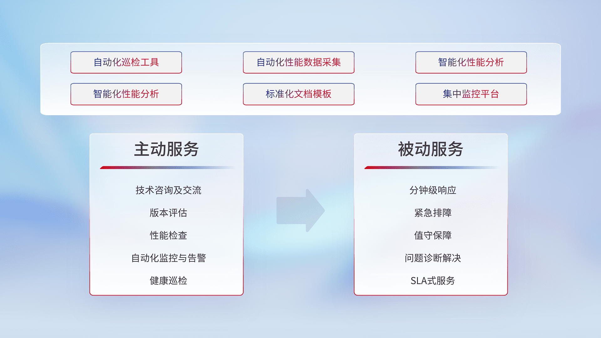 智能化工具和标准化文档,,保障服务质量,,提供主动服务(包含技术咨询、、、、版本评估、、性能检查、、自动化监控与告警、、健康巡检)和被动服务包含(分钟级响应、、、紧急排障、、值守保障、、、、问题诊断解决、、、、SLA服务)。。。